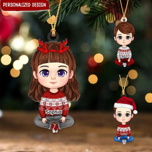 Niedliches Puppenkind sitzend, personalisiertes Ornament