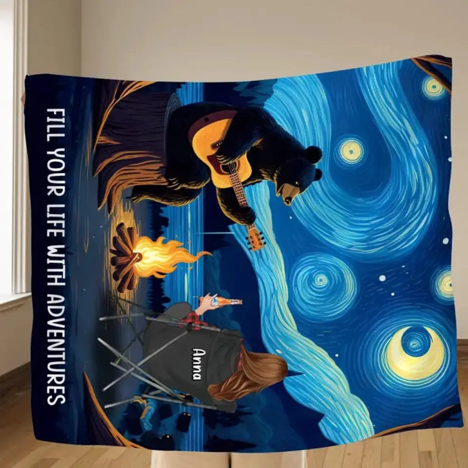 Custom Personalized Camping Life Bear Playing Guitar Quilt/Single Layer Fleece Blanket - Gift Idea For Camping Lover - Fill Your Life With Adventures
